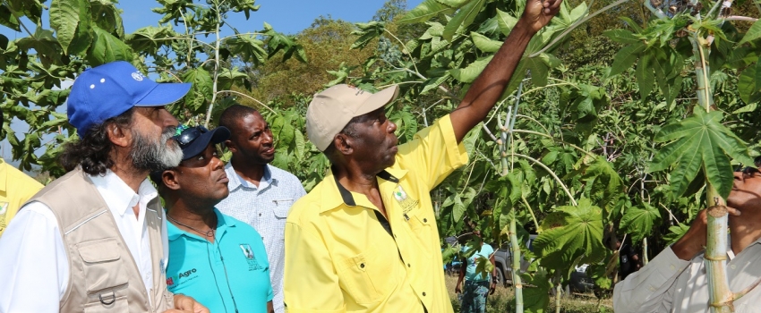 Hon J.C. Hutchinson (right), Minister without Portfolio in the Ministry of Industry, Commerce, Agriculture and Fisheries, points to castor beans under cultivation at the Holland Agro-Economic Zone in St. Elizabeth during a tour by Dr Crispim Moreira (left), Food and Agriculture Organization Representative in Jamaica, The Bahamas and Belize, on February 7, 2020. At centre is Peter Thompson, Chief Executive Officer, Rural Agricultural Development Authority. The 2,400- acre property, former sugar cane lands, has been leased by Holland Producers Ltd. Currently, 65 small farmers are engaged in the cultivation of a variety of crops including papaya, melon, sweet pepper, cantaloupe, sorrel, and sweet potato.