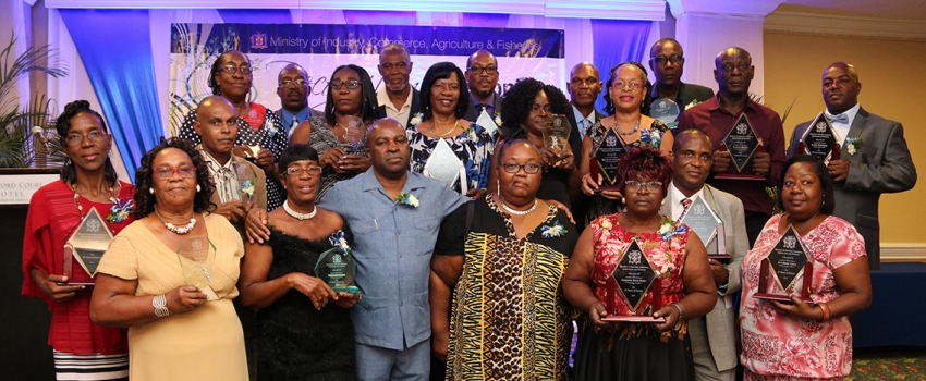 Retirees from the Ministry of Industry, Commerce, Agriculture and Fisheries who served for between six and 41 years as public servants pose with Acting Permanent Secretary, Dermon Spence (centre) at the Ministry’s the Recognition Ceremony for Retirees held at the Knutsford Court Hotel on Thursday, March 28, 2019.