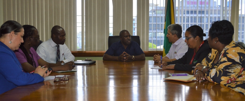 Acting Permanent Secretary in the Ministry of Industry, Commerce, Agriculture and Fisheries (MICAF), Dermon Spence (centre), along with (from left) Principal Director-Technical Services, Rural Agricultural Development Authority, Marina Young; Senior Director, Agricultural Land Management Division, MICAF, Joan Brown Morrison; Chief Technical Director for Special Projects at the Ministry, Courtney Cole; Managing Director, Newport Fersan, Dennis Valdez; Business Development Manager, Newport Fersan, Hedda Rose Pitter; and Director, Special Projects, MICAF, Yolando Gibson, during a courtesy call at the Ministry’s New Kingston offices on Thursday, May 2, 2019. The meeting discussed developments in the agricultural sector, focusing on crops such as pineapple, hot peppers, onion, Irish potatoes, ginger and yam as well as opportunities for further cooperation between the Ministry and Newport Fersan.
