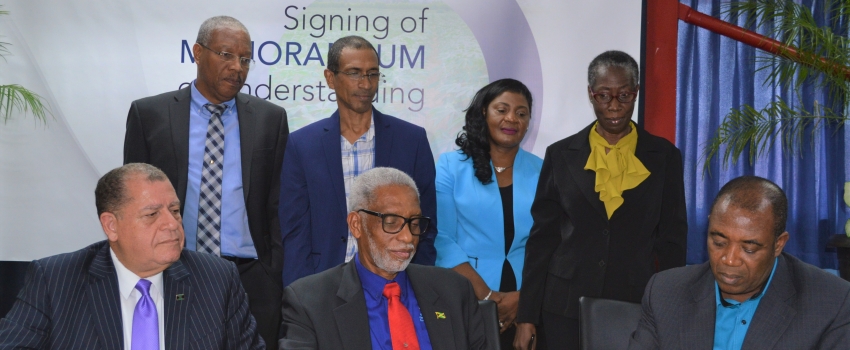 Chief Executive Officer, Rural Agricultural Development Authority (RADA), Peter Thompson (right); and President, Community and Workers of Jamaica Co-operative Credit Union Limited (C&WJCCUL), Condell Stephenson (centre), sign a memorandum of understanding between the Rural Agricultural Development Authority (RADA) and the Community and Workers of Jamaica Co-operative Credit Union Limited (C&WJCCUL), at the C&WJCCUL, Half-Way Tree Road, on Tuesday, June 18, 2019. Sharing in the moment are Minister of Industry, Commerce, Agriculture and Fisheries, Hon. Audley Shaw (left); along with (background l-r) Chief Executive Officer, C&WJCCUL, Carlton Barclay; RADA’s Board Chairman, Nigel Myrie; Senior Regional Manager, C&WJCCUL, Andrea Mumby; and Director, C&WJCCUL, Paulette Howell. RADA and C&WJCCUL signed an MoU to solidify a loan programme for farmers registered with RADA to access financial benefits, which will ultimately stimulate improved productivity for farmers.