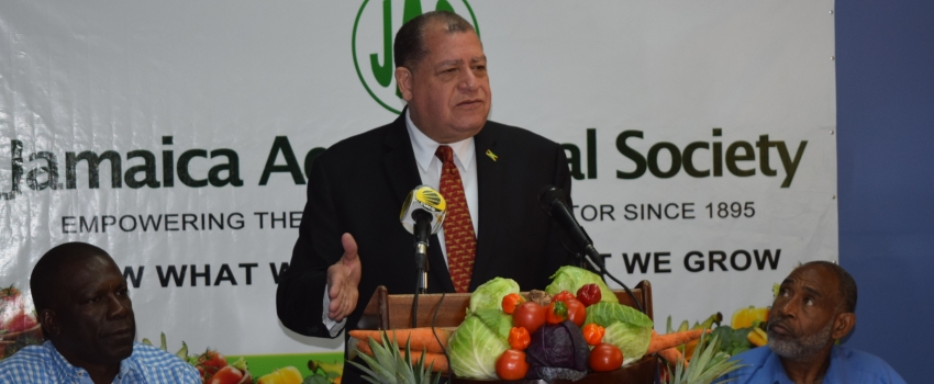 Minister of Industry, Commerce, Agriculture and Fisheries, Hon Audley Shaw, speaking at the launch of the 35th anniversary of Farmers’ Month, held at the headquarters of the Jamaica Agricultural Society(JAS) in Kingston today (April 4). From left are Norman Grant, President; and 1st Vice-President, Donald Berry, both of JAS.