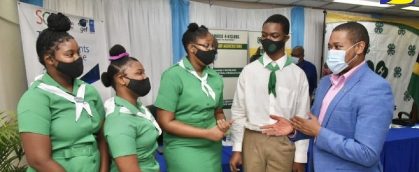 Minister of Agriculture and Fisheries, Hon. Floyd Green (right), interacts with 4-H clubbites from Kingston and St. Andrew, at the launch of the Youth in Agriculture Roadmap, on November 12, at the Ministry in Kingston.
