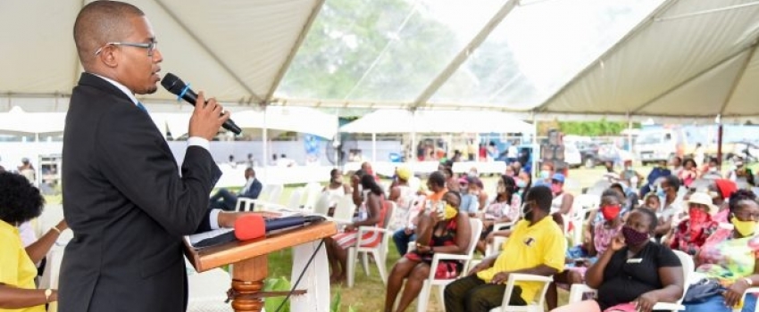 Minister of State in the Ministry of Industry, Commerce, Agriculture and Fisheries, Hon. Floyd Green, addresses a community meeting at the Clifton Playfield in St. Catherine on Wednesday (July 15).