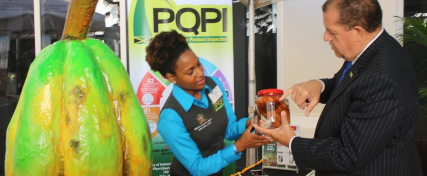 Hon Audley Shaw, Minister of Industry, Commerce, Agriculture, and Fisheries, and Monique Solomon, Entomologist, Plant Quarantine/Plant Inspection Branch, Ministry of Industry, Commerce, Agriculture and Fisheries; view specimen of frosty pod rot infected cocoa during a tour of displays at the Opening Ceremony of the 11th Annual Caribbean Plant Health Directors’ Forum held in Montego Bay, St. James, on July 16.