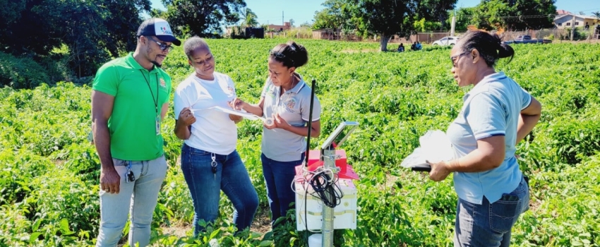 Members of a team from the Plant Quarantine Produce Inspection Unit of the Ministry of Agriculture, Fisheries and Mining, set up a Tomato Leafminer smart trap in the field.