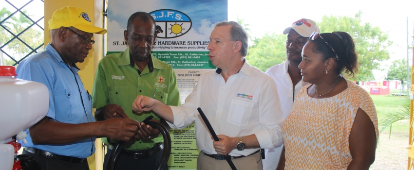 Thomas Davidovich (centre), Regional Manager for Latin America and the Caribbean, Naandanjain Irrigation Company; explains use of irrigation equipment with (from left) O’Brien Johnson, Managing Director, St. Jago Farm & Hardware Hardware Supplies Ltd; Hon. J.C. Hutchinson, Minister without Portfolio in the Ministry of Industry, Commerce, Agriculture and Fisheries and Colbeck farmers Edmond Harris and Sharon Donegan at a seminar on irrigation held at Denbigh Showground in Clarendon on May 16.
