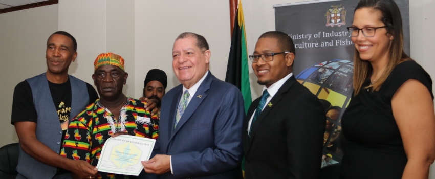 Industry, Commerce, Agriculture and Fisheries Minister Hon. Audley Shaw (third right) congratulates, Accompong Town maroon Colonel Ferron Williams (second left), by presenting him with a certificate of authorization to grow marijuana , at the signing of a tripartite agreement , at the Ministry’s St. Lucia offices in New Kingston on July 8. Others participating (from left), are, President and Chief Executive Officer (CEO) of Timeless Herbal Care, Courtney Betty, Consultant at Timeless Herbal Care, William Rennalls, State Minister in the Ministry, Hon. Floyd Green and Chairperson of the Cannabis Licensing Authority, Hyacinth Lightbourne.