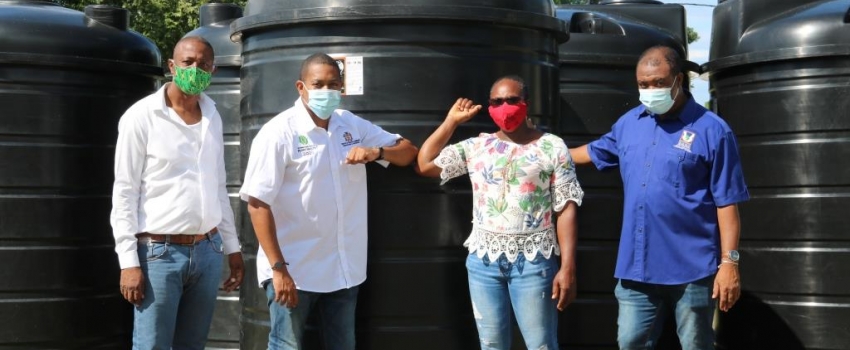 Minister of Agriculture and Fisheries, Hon. Floyd Green (second left), along with farmer from New Works, Westmoreland, Pamela Robinson (second right), at the handover of water tanks at the Rural Agricultural Development Authority (RADA) Parish Office in Llandilo, Westmoreland, on October 8. Others from left are Central Westmoreland Member of Parliament, George Wright, and RADA Chief Executive Officer, Peter Thompson. Five hundred tanks are being distributed islandwide under the Ministry’s Production Incentive Programme to alleviate the impact of drought. To date, a little over 200 tanks have been distributed and the remainder should be distributed by the end of October.