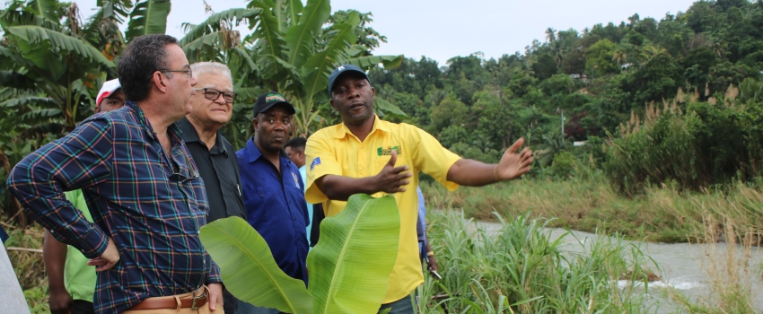 Oral Lewis (right), of The Banana Board, explains the impact of the Swift River on banana farms at Canewood in Portland to (from left) Member of Parliament for West Portland Daryl Vaz, the Hon Karl Samuda, Minister of Industry, Commerce, Agriculture and Fisheries, and Peter Thompson, Chief Executive Officer, Rural Agricultural Development Authority, during a tour of flood-ravaged farms in Portland on February 1.