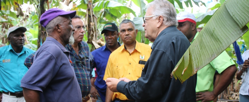 Hon Karl Samuda (right), Minister of Industry, Commerce, Agriculture and Fisheries, discusses damage to the 12.6-acre farm of Selvin Richards(left) at Canewood in Portland during a tour of flood-damaged farms in Portland on February 1. Others from left are Member of Parliament for West Portland Daryl Vaz, Chief Executive Officer Peter Thompson; and Michael Stern, chairman; both of the of the Rural Agricultural Development Authority.