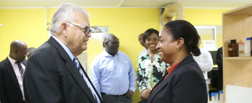 Minister of Industry, Commerce, Agriculture and Fisheries, Hon. Karl Samuda, greets Quality Manager at the Veterinary Services Division of the Ministry of Industry, Commerce, Agriculture and Fisheries, Tricia Fraser, during a tour of the JANAAC-accredited laboratory in St. Andrew on Wednesday, January 31.