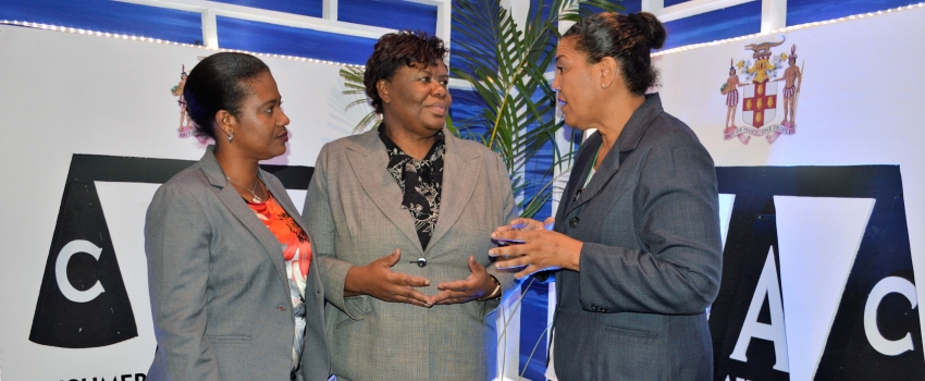 Chief Executive Officer, Consumer Affairs Commission, Dolsie Allen (centre), in discussion with (from left) Director, Commerce Division, Ministry of Industry, Commerce, Agriculture and Fisheries, Michelle Parkins; and Executive Director, Jamaica Intellectual Property Office, Lilyclaire Bellamy, at the Word Consumer Rights Day 2018 Seminar and Exhibition, under the theme, ‘Making Digital Marketplaces Fairer: Access, Security and Protection‘, at the Knutsford Court Hotel, New Kingston, on Thursday March 15, 2018.