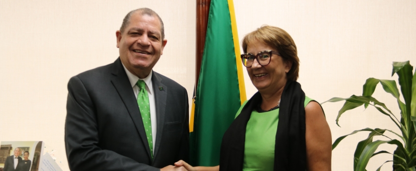 Industry, Commerce, Agriculture and Fisheries Minister, Hon. Audley Shaw (left), greets outgoing World Bank Country Representative to Jamaica, Galina Sotirova during a farewell visit to the Ministry’s St. Lucia Avenue offices in New Kingston on August 27. Minister Shaw and Ms. Sotirova discussed her new posting in the United States and projects the Bank has with Jamaica in Agriculture such as the Promoting Community-based Climate Resilience in the Fisheries Project.